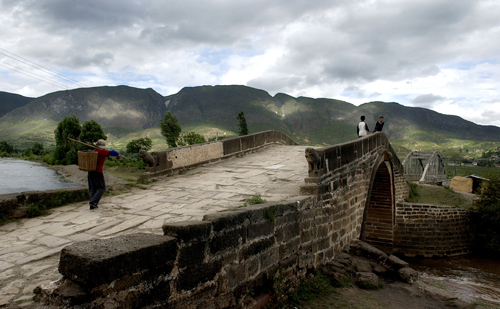 桥锁清江。于玉津桥上看玉水环绕,碧水映楼,似一幅古朴的天然画卷。上到桥中,看湍湍而过的黑潓江水,耳边似乎又响起了嗒嗒的马蹄声和马锅头的吆喝声。曾经,这里是南连大理地区的第一桥,也是所有南来北往马帮的必经之路。在茶马古道上,像这样的桥成千上万,木板桥、古板桥、铁索桥、藤桥、溜索桥比比皆是,它们大都建在河流大江之上。如今,已经有很多桥因年代久远被冲毁,或是因为古道的衰落而废弃,寻不到当年的足迹。只有眼前的玉津桥,还在顽强地向所有人讲述着这里曾经发生的故事。