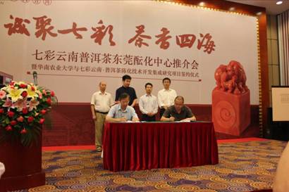 2012年5月5日,七彩云南普洱茶东莞酝化中心推介会暨华南农业大学与七彩云南普洱茶陈化技术开发集成研究项目签约仪式在东莞明轩酒店隆重召开。