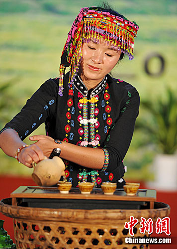 图为云南茶博会上,拉祜族姑娘向观众展示传统“秘茶”的泡制过程。