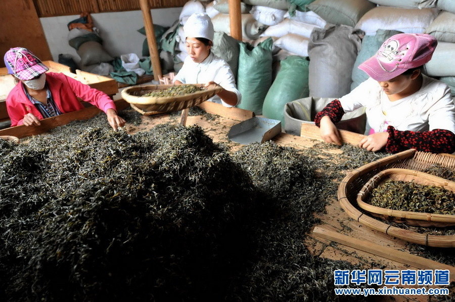 云南省普洱市镇沅彝族哈尼族拉祜族自治县恩乐镇复兴村的几名拉祜族妇女在茶厂内将春茶中的枯枝和杂草分拣出来
