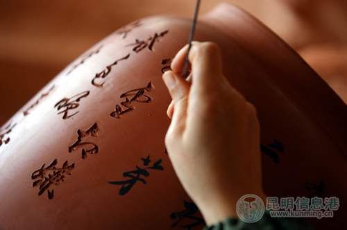 工作人员在紫陶工艺品上刻字