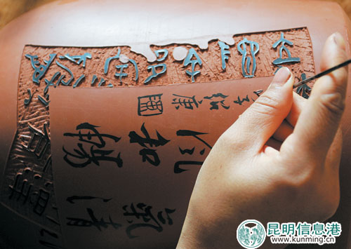 工作人员在紫陶花瓶上对花纹进行雕刻·资料图片