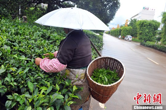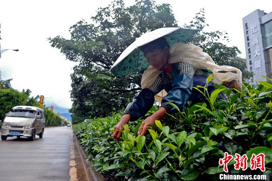 8月1日,云南普洱市内一主干道的绿化带上,种满了生机盎然的茶树,一些茶农就在绿化带内采摘鲜嫩的茶叶,种满茶树的公路绿化带成为云南普洱市内的别致一景。云南普洱市曾是“茶马古道”上的重要的驿站,是著名的云南普洱茶的重要产地之一,也是中国最大的产茶区之一。