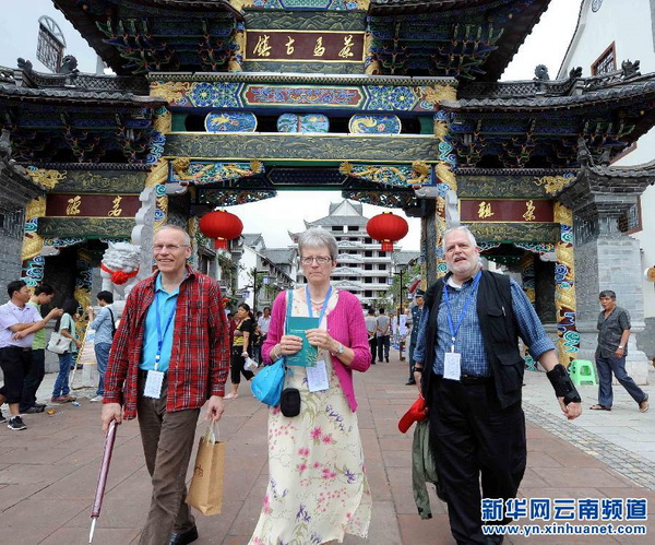 5月26日,几名外国客商走出茶马古镇茶叶交易市场。当日,在云南省普洱市举行的国际茶业盛会2013国际茶业大会与第八届中国云南普洱茶国际博览交易会、第十三届中国云南普洱茶节(简称“两会一节”)上,茶马古镇茶叶交易市场人气兴旺,来自国内外的客商品茗畅谈,虽很少达成实际销售,但达成许多采购、合作意向。