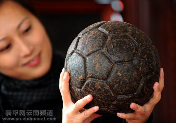 耗时一年才制成的一枚重6.3公斤的云南普洱茶足球造型陈列品(1121摄)。