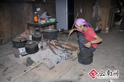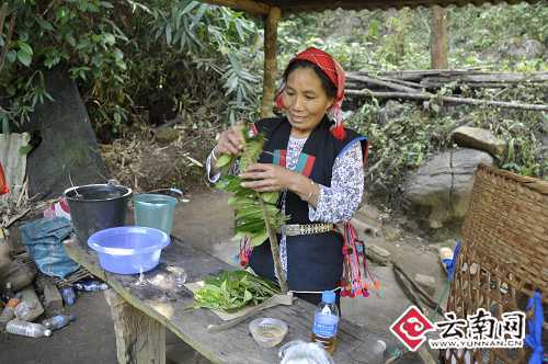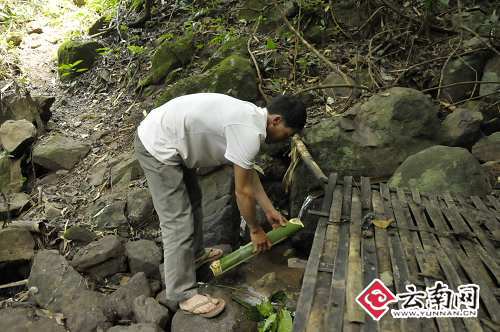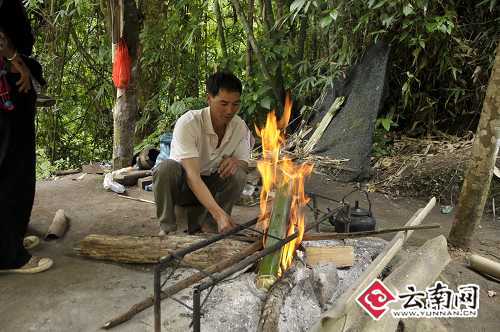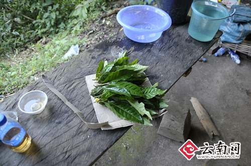 在细斟慢品之间,三角架火塘那边也很快飘来另一种香气,原来,开才专门为我们做了一个特色山寨菜——竹筒煮鸡,茶香、鸡香、竹筒香、山寨米饭一齐香,香香入味,勾得我们馋性大动,“茶王之家”的家宴也可称“私房菜”开宴了。一碗竹筒煮鸡、一碗竹笋、一碟竹笋酱(南糯)、一盆山地小苦菜、一碗山猪肉、一碟“难呢”(一种哈尼蕃茄酱),还有一盘炸山鸡蛋,虽无大鱼大肉,但也是南糯风味,才娘一个劲地劝我们多吃点,而开才则不时将竹筒鸡夹在大家碗中,一个劲地说着与才娘一样的话:多吃一点!