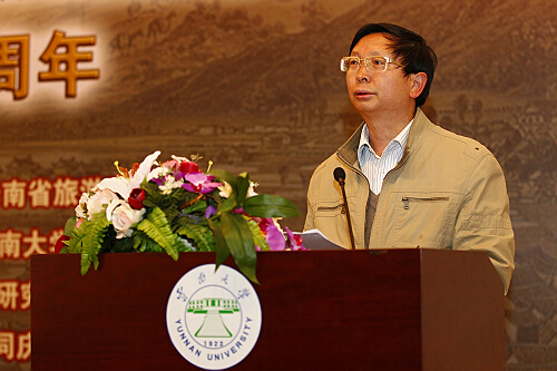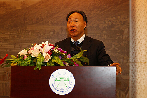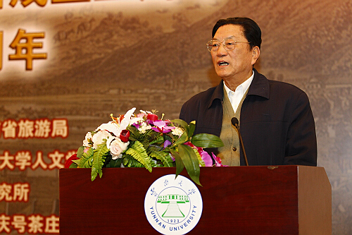 张宝三在开幕式上致辞。他说,茶马古道研究这几年,特别是云大的党政领导对茶马古道研究非常关心,茶马古道文化研究所这几年工作开展的非常好,取得了很好的成果。当然我们现在不但国内,包括国际上,对茶马古道的研究,很多专家学者都花费了很多的心血。所以这个茶马古道的名声现在也越来越响亮。张宝三认为茶马古道在边疆民族地区以及对外经济文化交流方面发挥了重要的作用,加强了各民族间的联系交往,各个民族间的团结友爱更加紧密。