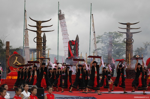 彝族小伙在祭茶祖仪式上表演跳菜舞