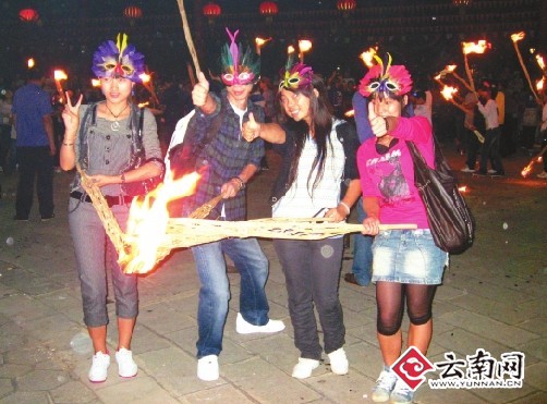 方!”姑娘小伙们点燃火把、释放激情,体验了火把节的狂欢乐趣。