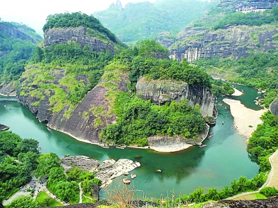 赏景:武夷山风景名胜区位于武夷山市南部,方圆70平方公里,属典型的丹霞地貌,在世界同类自然景观中独树一帜。碧水丹山之中拥有“三三”、“六六”、“九九”之胜。“三三”指的是碧绿清透盘绕山中的九曲溪,“六六”指的是千姿百态夹岸森列的三十六峰,“九九”指的是翘首东望矗立山中的九十九岩。