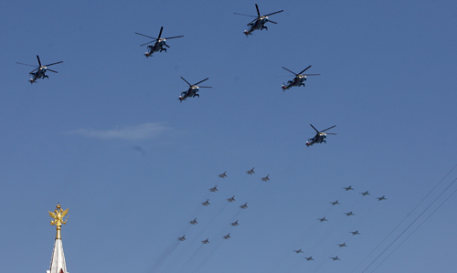 俄军共展示161件重型地面武器。稍后,127架各式战斗机、预警机、空中加油机和直升机从不同高度飞过红场上空。空中方队最后,由6架“苏—27”型战斗机组成的“俄罗斯勇士”表演方队喷出白、蓝、红三色烟雾,勾画出俄罗斯国旗。由1200人组成的混合军乐团行进至红场中央,奏响《欢乐颂》和独联体国家“没有边界的国歌”《胜利日》,为70分钟阅兵式降下帷幕。