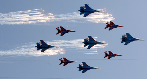 俄罗斯“勇士”和“雨燕”飞行表演方队飞过红场