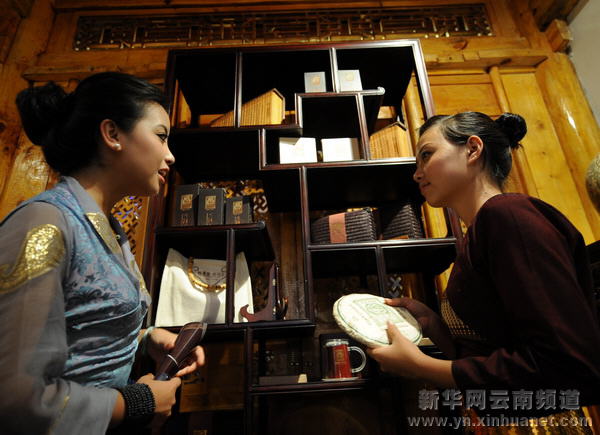 9月4日,格桑群宗(左)向哈尼族姑娘万海燕了解云南普洱茶。