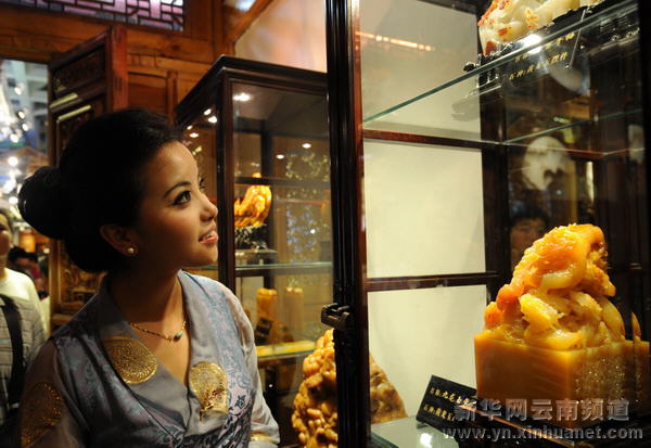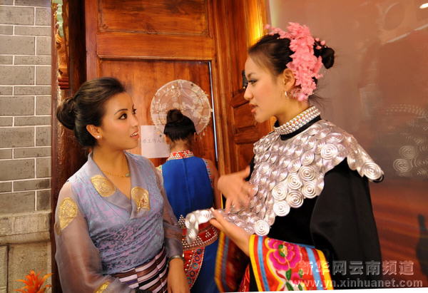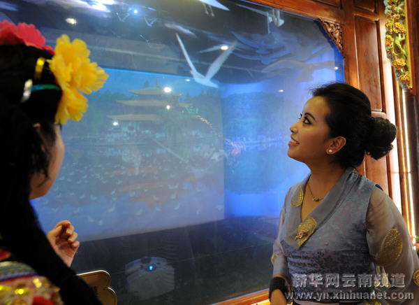 9月4日,格桑群宗(左)被云南馆演员华丽的服饰所吸引。