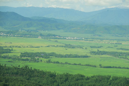 云南省西双版纳州勐海县勐遮坝子中间有佛双公路干线从东南而西穿坝而过,其间有一段长约10公里的路面,笔直无弯,如用墨线弹在坝子中间一般。云南省西双版纳州勐海县勐遮坝坝子附近有许多风景名胜,坝子中间有座“有新世纪冰川沉积”的公乌龟山隆起,山丘之顶有勐遮土司“王宫”遗址和南峤县政府遗址。这座山丘亦是解放西双版纳的激战之地。坝子东南有国家级保护文物景真八角亭和景色迷人的勐邦天鹅湖。坝子东北边沿有当地极有名气的曼洪瀑布。云南省西双版纳州勐海县勐遮坝子不仅以宽阔而名扬全州,还有云南西双版纳粮仓之誉。 |