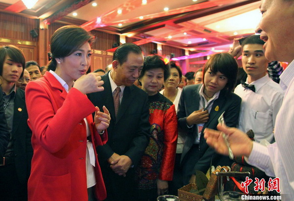 2012年1月18日,中国驻泰国大使馆在使馆内举行“开门过大年”迎新春活动。泰国总理英拉应邀出席,并在中国驻泰大使管木及夫人的陪同下,一起学习包饺子、观看佛山泥人制作、传统剪纸艺术以及文艺节目表演等中国传统民俗文化。上图为泰国总理英拉在中国茶艺展示台前,品尝独具特色的中国云南普洱茶。