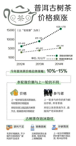 据收茶人某先生介绍,云南普洱茶古树茶和普通台地茶价格差别很大,今年普通台地茶制作的云南普洱茶春茶总体上涨幅度约为10%,而云南普洱茶古树茶毛茶的收购价上涨幅度则从30%到100%不等。云南西双版纳老班章茶区所产的云南普洱茶古树茶,被称为“云南普洱茶中的霸王”。某先生透露,今年顶级云南老班章古树茶毛茶的最高价格已达1.7万元/公斤,比2013年8000元/公斤的最高价翻了一倍多,普通云南普洱茶老班章古树茶毛茶的价格也在6000元/公斤左右。不仅云南老班章茶区,就云南老曼娥茶区、云南曼茶区等产区所产的云南普洱茶古树茶毛茶价格涨幅也很大。