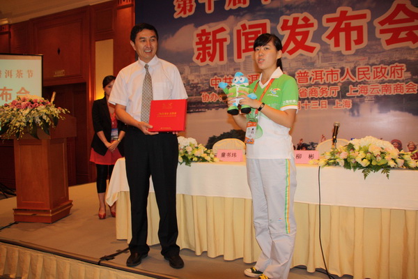 又讯(记者苏莉 文/图) 丹桂飘香,秋风送爽,中秋佳节来临之际,云南普洱市各族人民为上海世博园志愿者送上了一份真情和敬意。昨日,在第十届中国云南普洱茶节新闻发布会上,云南普洱市向世博园志愿者“小白菜”赠送中秋礼物,云南普洱市委常委、宣传部部长柳彬代表云南普洱市为中秋节仍然在世博园内辛勤工作的志愿者赠送价值2万元的礼物,表达对志愿者的节日问候和敬意。