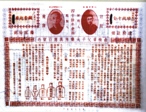 说起云南白药的早期注册商标,早在民国时期就已出现。存留在昆明市档案馆的这份“百宝丹注册商标”,是一份27厘米长、19.5厘米宽的广告,中间是发明人曲焕章和曲万增父子的肖像,其下是“曲焕章大药房万应百宝丹”的标语,右上有“功效十全”、“政府注册”字样。