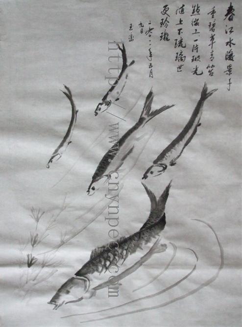云南普洱茶信息网推荐·茶人书画家·杨玉峦先生作品·春水游鱼图·中堂·