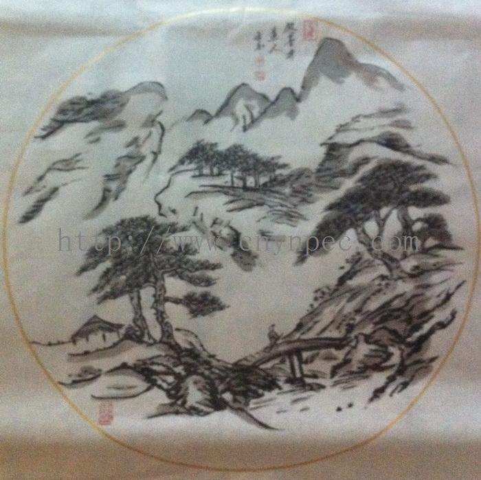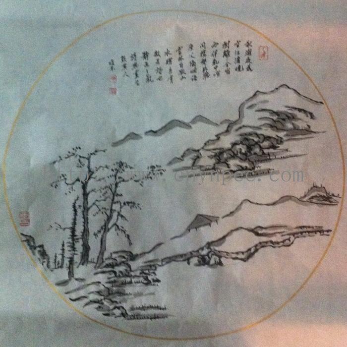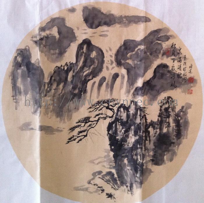 云南普洱茶信息网推荐·茶人书画家·耕田之子·丁焕东先生作品·山水图·圆形·斗方3