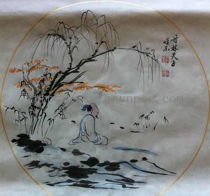 云南普洱茶信息网推荐·茶人书画家·耕田之子·丁焕东先生作品·山水图·圆形·斗方5