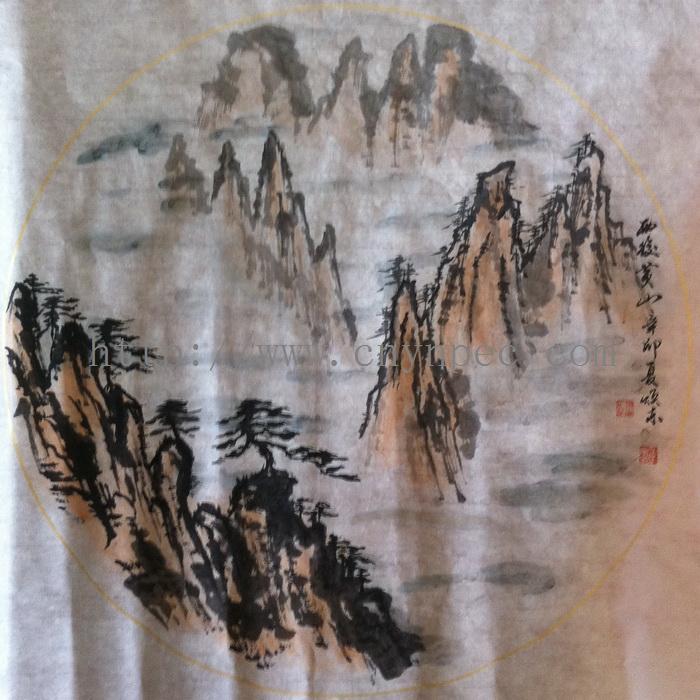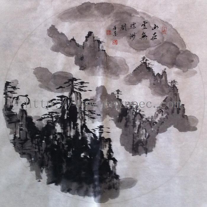 云南普洱茶信息网推荐·茶人书画家·耕田之子·丁焕东先生作品·山水图·圆形·斗方2