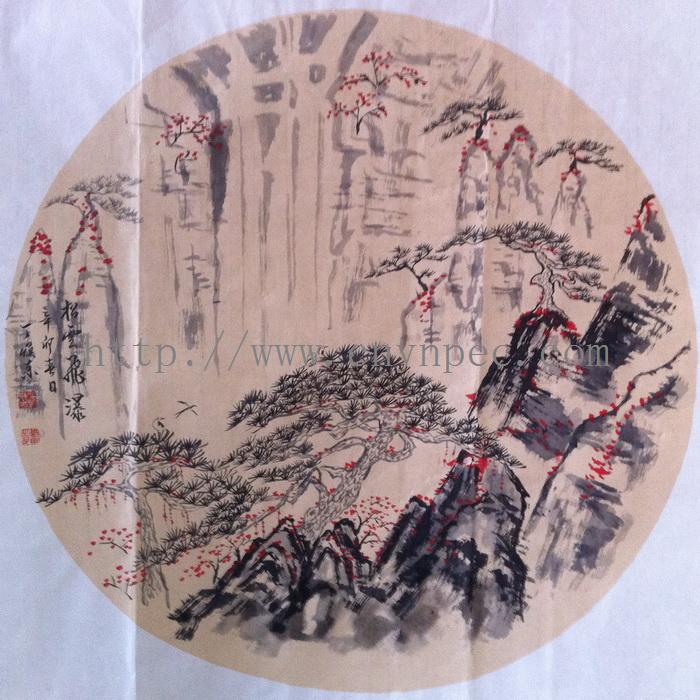 云南普洱茶信息网推荐·茶人书画家·耕田之子·丁焕东先生作品·山水图·圆形·斗方1