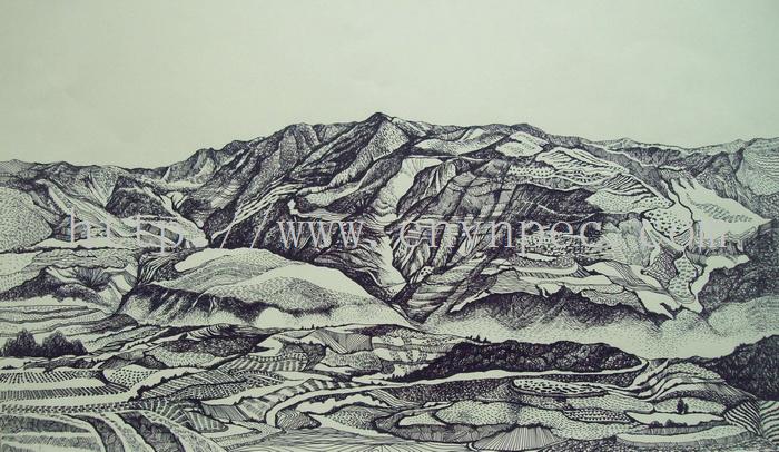 云南普洱茶信息网推荐·云南茶人书画家·欧阳菲女士作品·钢笔画·昆明东川山
