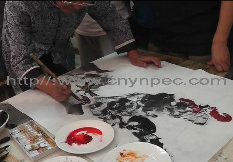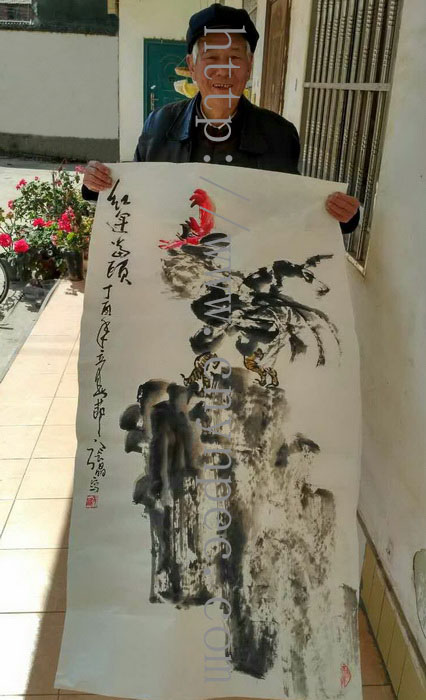 云南普洱茶信息网推荐·茶人书画家·张晶先生与其刚完成的作品·丁酉年正月初七大写意·鸡年作品·鸡图·红运当头