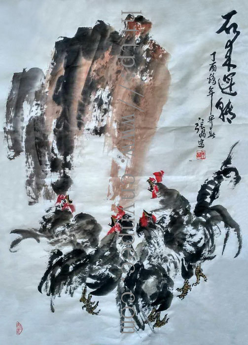 云南普洱茶信息网推荐·茶人书画家·张晶先生丁酉年正月初九大写意·鸡年作品·群鸡图·石来运转