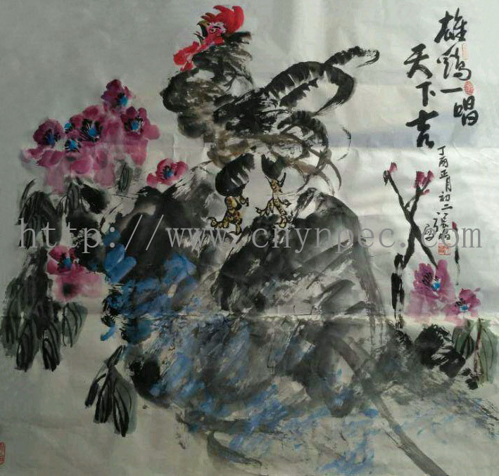 云南普洱茶信息网推荐·茶人书画家·张晶先生作品·丁酉年正月初二大写意·鸡年作品·鸡图·雄鸡一唱天下吉