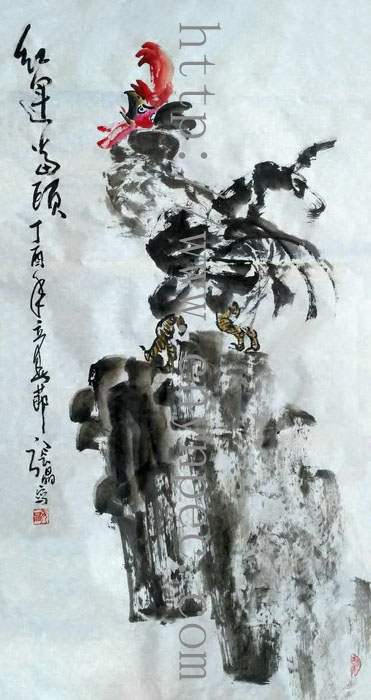 云南普洱茶信息网推荐·茶人书画家·张晶先生作品·丁酉年正月初七大写意·鸡年作品·鸡图·红运当头